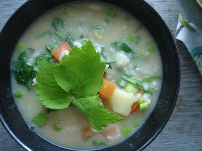 I suppose I've got it good - my only worry is nursing this nagging cold. As I've mentioned before, when sick, I turn to tried and tested comfort foods. It's unfortunate that one cannot live on pudding alone: one occasionally needs actual nourishment. Gruel is an awful sounding word, but when done right, gruel can be the perfect, cockles warming comfort food. In its plainest form, it will convey easily digested nutrients, but a few embellishments turns into a complete meal. Best of all, gruel makes good use of left-overs and mystery vegetables found at the bottom of the fridge.